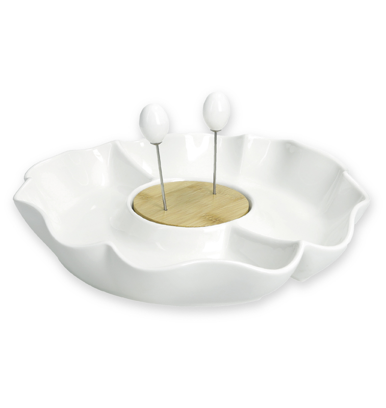 ANTIPASTIERA NUVOLA IN PORCELLANA BIANCA CON SUPPORTO e CON 4 FORCHETTINE IN BAMBOO