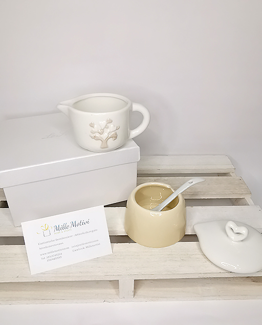 Bomboniera Moka zuccheriera disponibile in 2 modelli. Il coperchio con impugnatura a forma di cuore è in ceramica bianca.