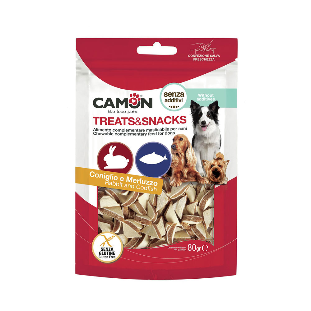 Composizione: Coniglio 75%, merluzzo 15%, proteine di piselli, amido di mais, glicerolo, sorbitolo