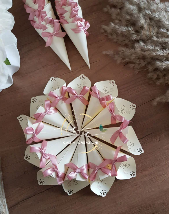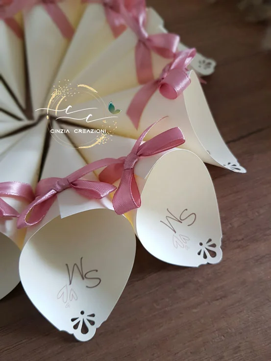 Questi coni portariso possono essere realizzati in cartoncino bianco da 140 grammi oppure in cartoncino avorio da 160 gr.
