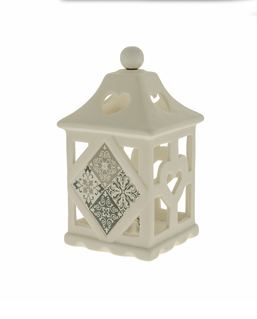 Bomboniera Lanterna led realizzata in ceramica bianca, al centro la lanterna è raffigurata da simboli maiolici. Nuova collezione 2023.