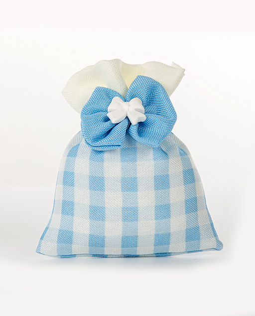 Sacchetto quadrettato celeste con applicazione fiocco in gessetto . Sacchetto realizzato in cotone.