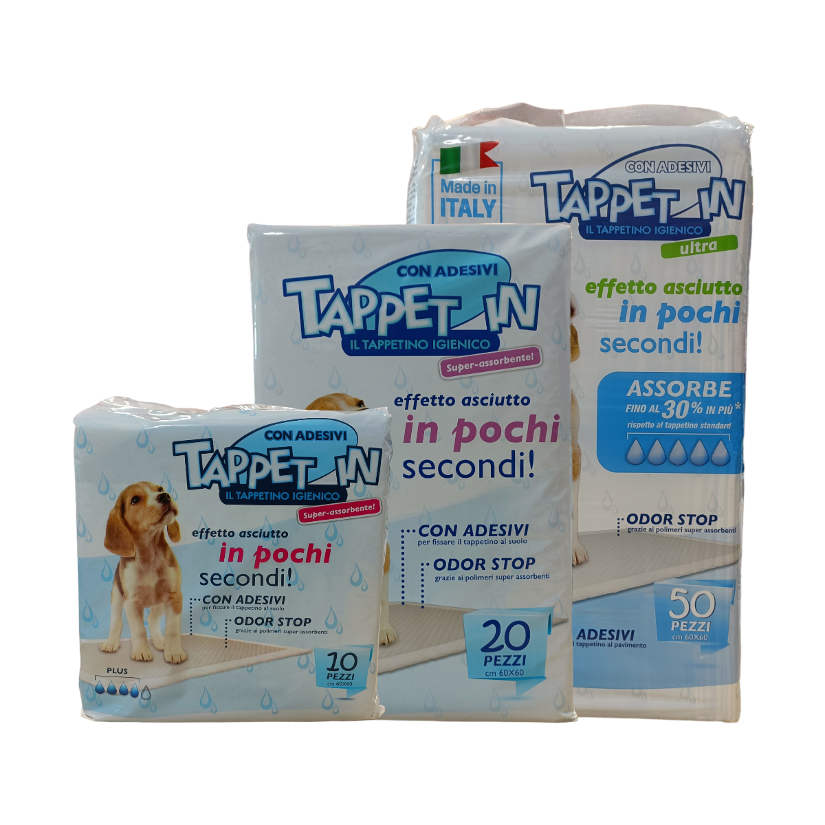 Infine l’ultimo strato, impermeabile, mantiene la superficie sottostante perfettamente asciutta. Gli speciali strip adesivi consentono di mantenere il tappeto sempre in posizione, mentre i 4 cm di bordo evitano fuoriuscite e facilitano la dismissione del prodotto. Ideale in casa come in viaggio, Tappet In può essere utilizzato anche come fondo per cucce e trasportini.